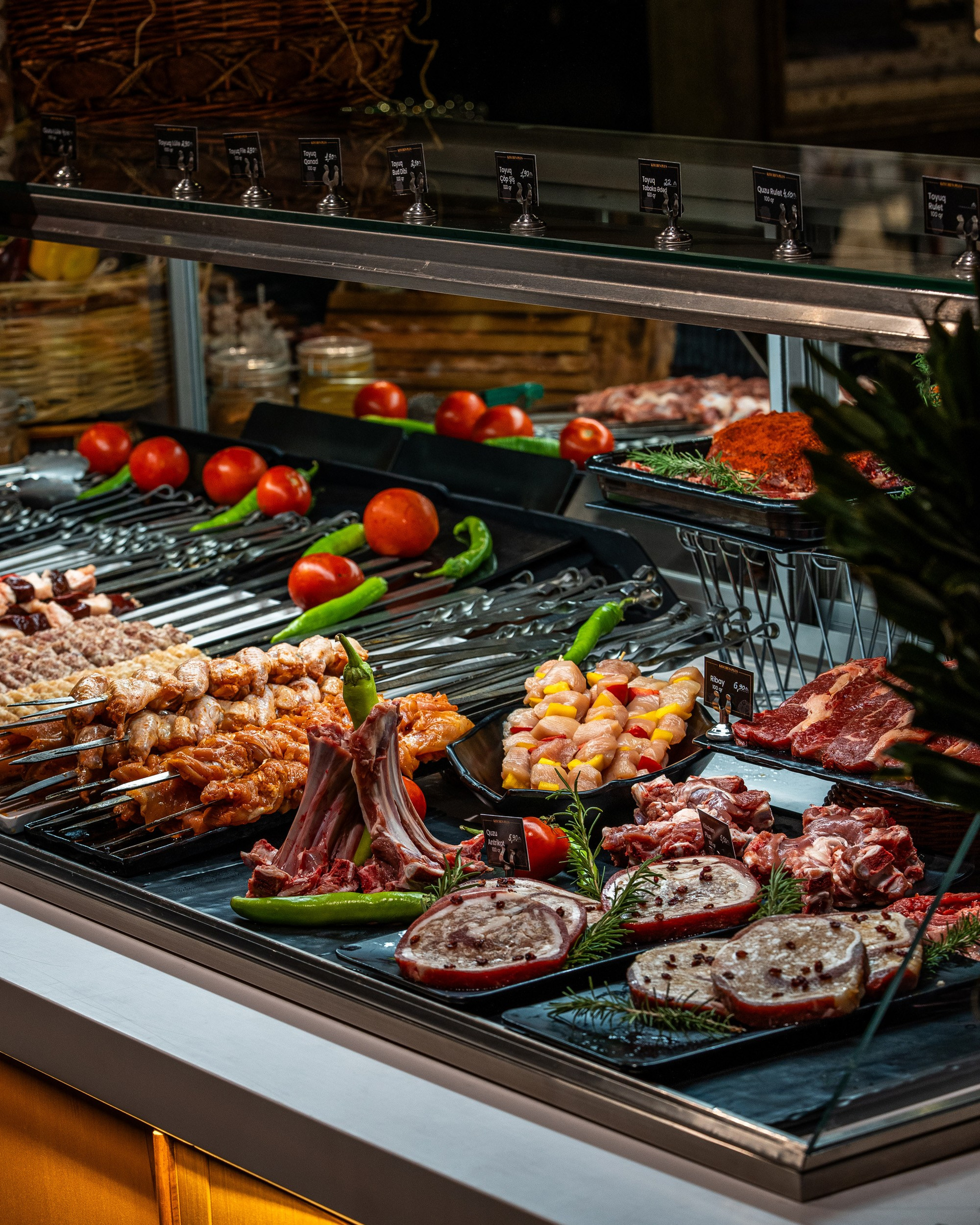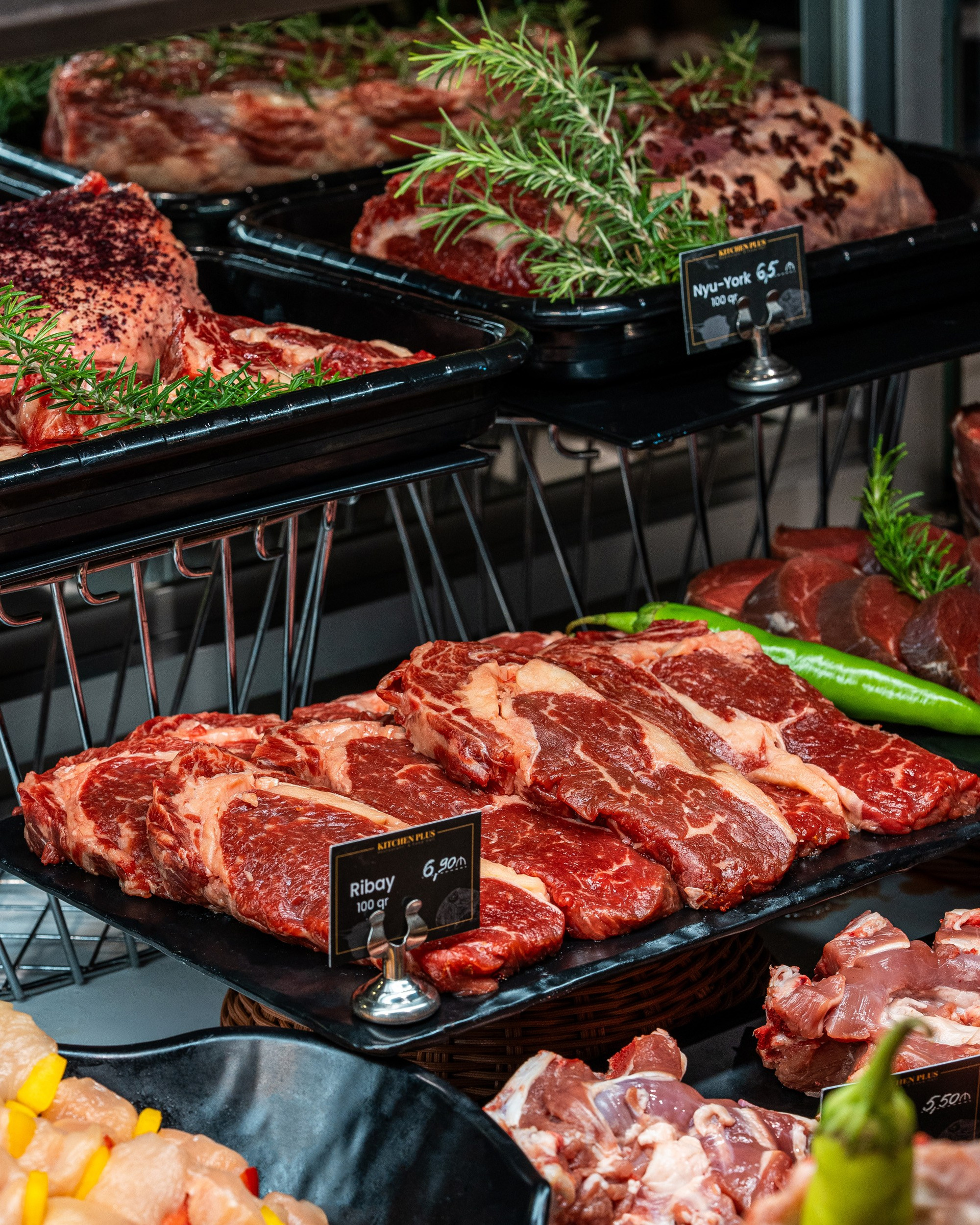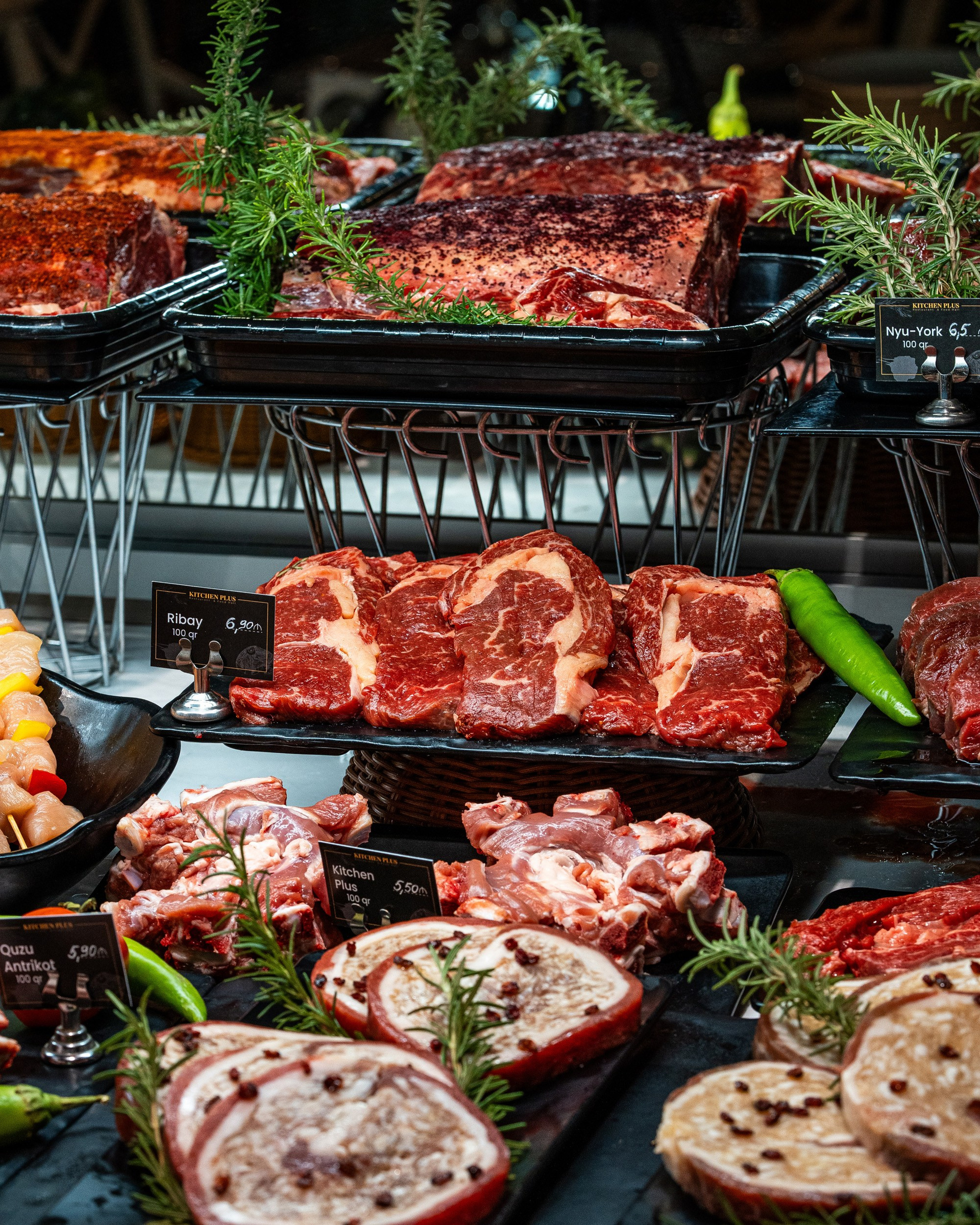 - Tərəvəz və meyvələr: pomidor, limon, sarımsaq kimi məhsullar ətin təzəliyini vurğulayır.