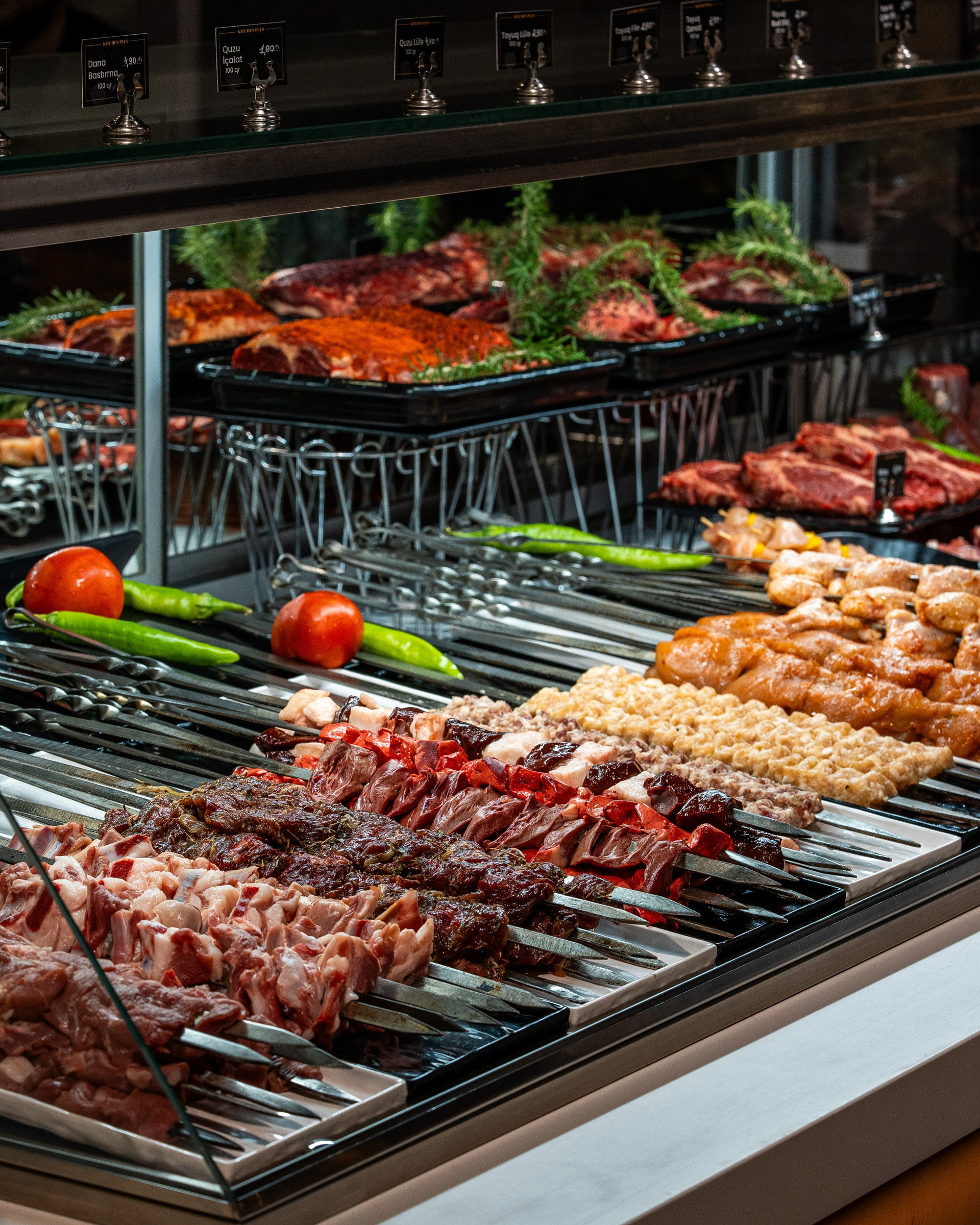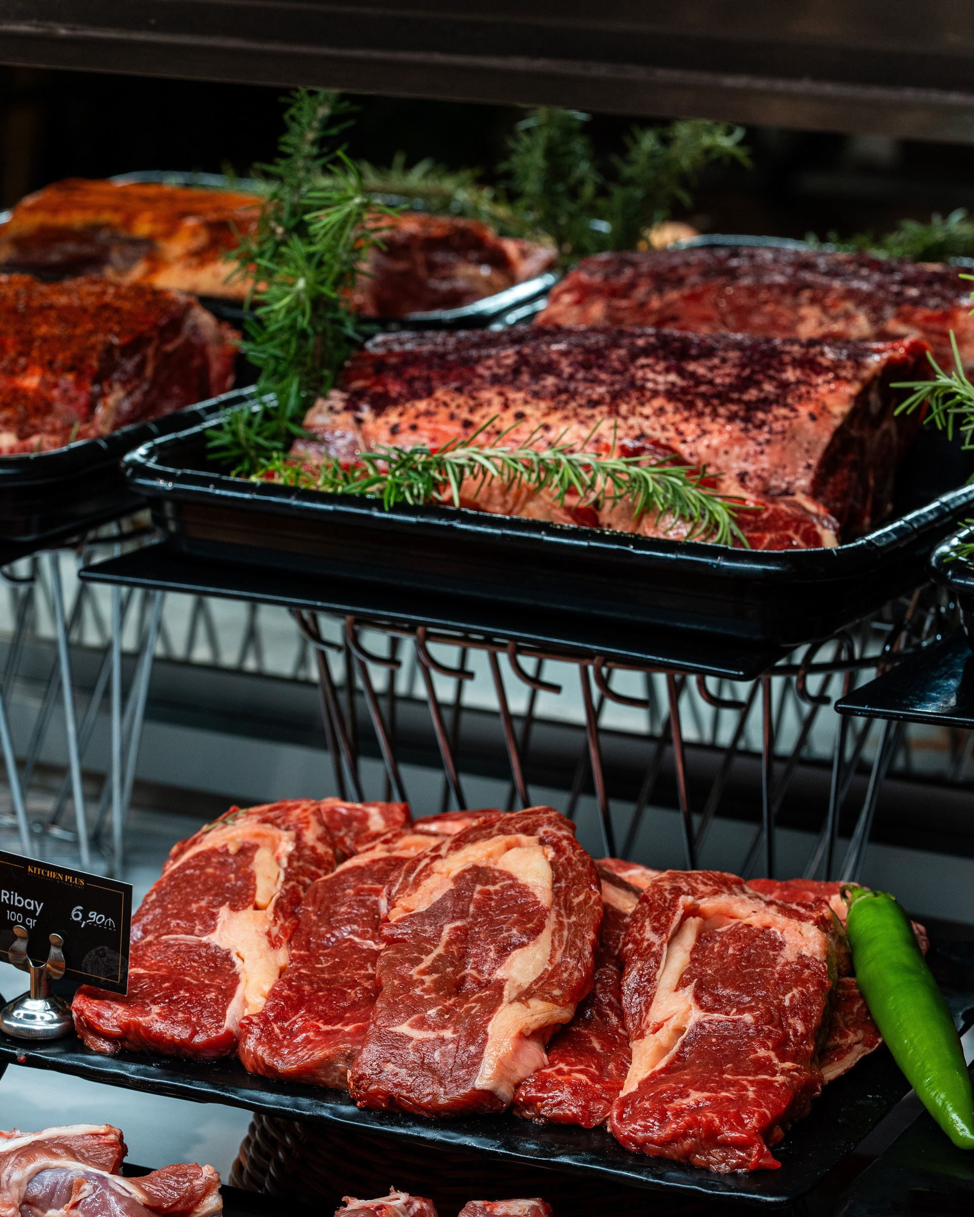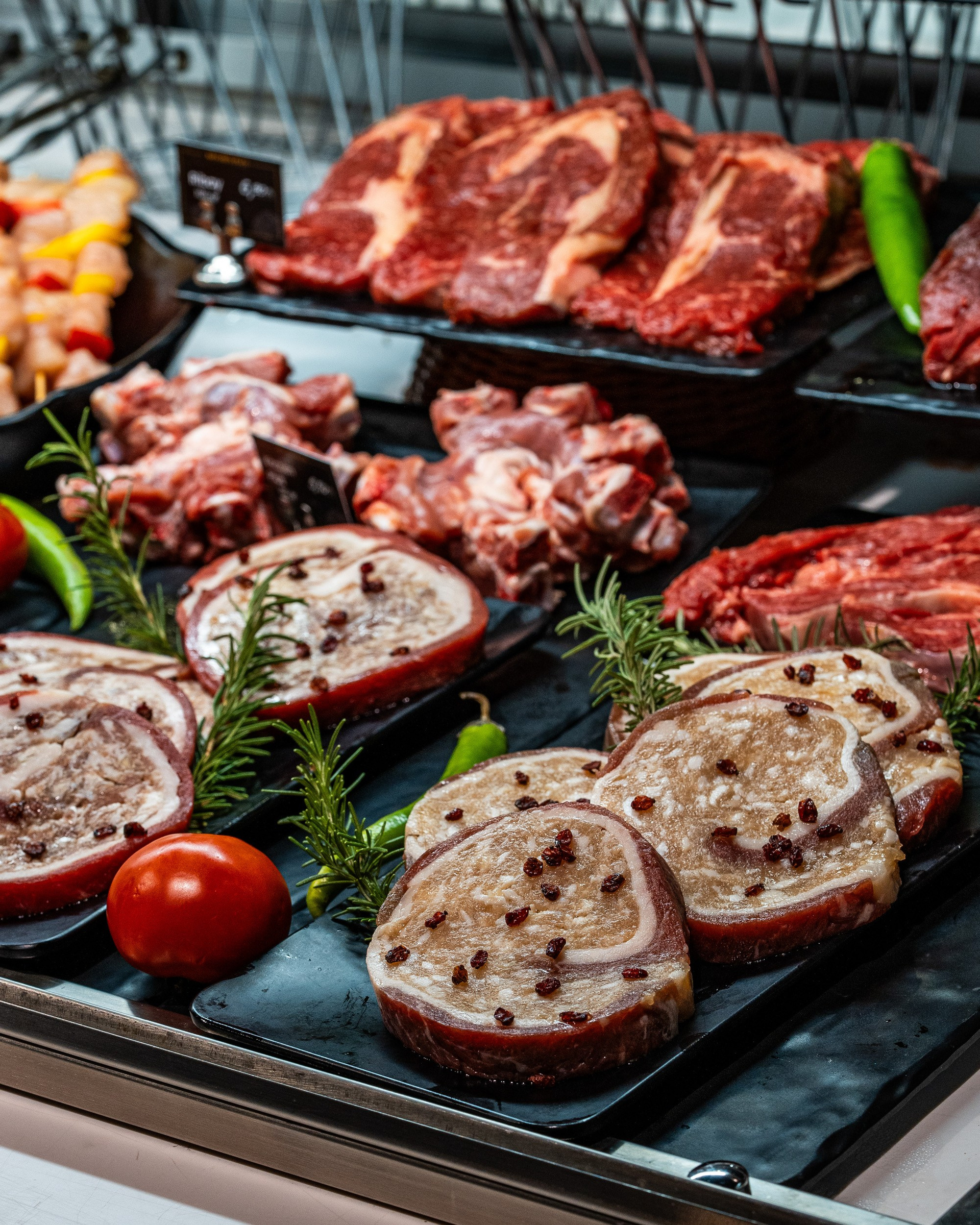 - Tərəvəz və meyvələr: pomidor, limon, sarımsaq kimi məhsullar ətin təzəliyini vurğulayır.